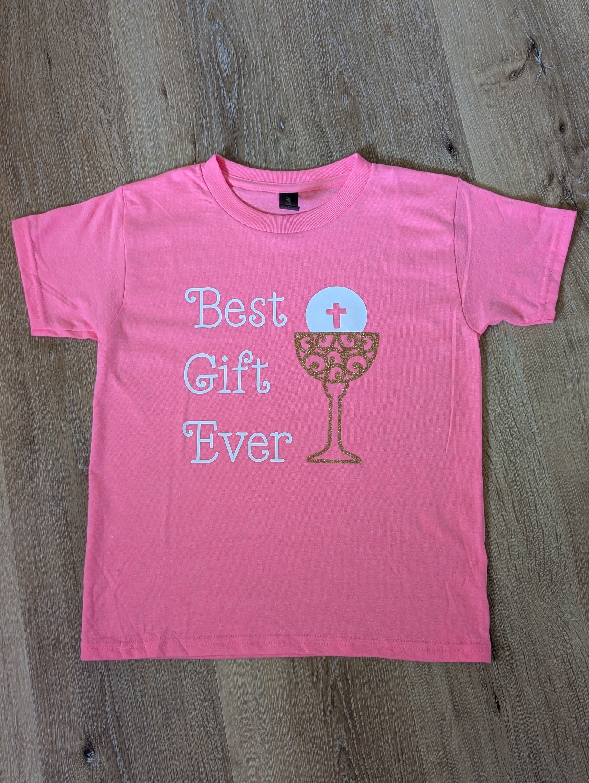 Celebrate the sacred milestone of First Holy Communion with this meaningful “Best Gift Ever” t-shirt. Featuring a graceful spiral font and a glitter vinyl chalice adorned with elegant details, this shirt is a beautiful way to reflect the true gift of the Eucharist.